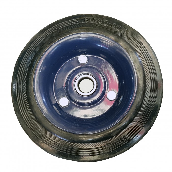 Это колесо имеет диск состоящий из двух половинок окрашенного металла, они стянуты между собой болтами по центру установлен подшипник, такая компоновка позволяет использовать сам диск повторно, а при необходимости заменить подшипник или сам скат. Благодаря качественному покрытию металла краской предотвращается коррозия что позволяет дольше эксплуатировать диск. Сама шина изготовлена из цельной резины, Это позволяет ей мягко двигаться по любым поверхностям не повреждая напольное покрытие. Это колесо предназначена для установки на любые Тачки или тележки, как промышленные так и для частного пользования.