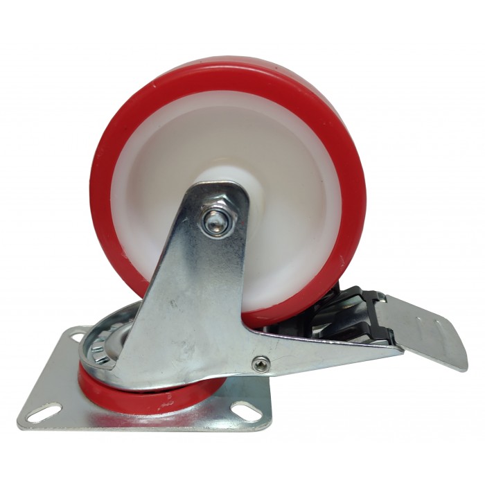 Колесо полиамид-полиуретан 100 мм на кронштейне с тормозом, сочетает в себе свойства пластиковых и резиновых колес. Основа колеса выполнена из прочного материала полиамида, а контактный слой из полиуретана, сочетание таких материалов в свою очередь придают колесу высокую прочность, износоустойчивость, а так-же сопротивление к коррозии и деформации. Такого плана колеса получили широкое распространение в химической, пищевой и легкой промышленности благодаря своим свойствам в сочетании полиамида с полиуретаном. Поворотное колесо 100 мм с тормозной системой представляет из себя обычное колесо отлито из полиамида и шину выполненную из полиуретана присоединенное к кронштейну размером 100*80 мм, расстояние между крепежными отверстиями 80*60 мм. Но к обычному поворотному механизму из оцинкованной стали добавлен элемент который пока нажатии фиксирует колесо и Ваш стеллаж или тележку в нужно положении. Благодаря таким материалам колесо может спокойно стоять почти на любой поверхности даже под небольшими углами. Данное колесо имеет подшипник скольжения, и является самым тихим колесом из нашего ассортимента. Их можно использовать в стерильных помещениях. В поворотной механизме установлен шариковый подшипник для более плавного поворота колес.