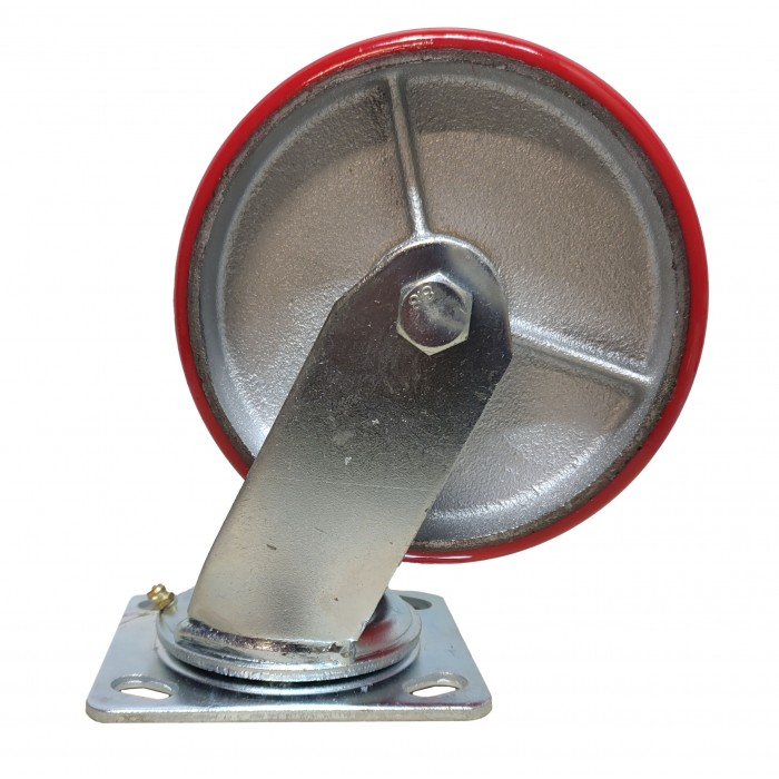 Колесо большегрузное 150 мм из чугун-полиуретана на поворотном кронштейне отлито из чугуна и сверху покрыто полиуретаном, такое сочетание позволяет ему переносить больше нагрузки и при этом сохраняет плавность хода, так же может более комфортно преодолевать стыки в покрытии. Колесо имеет диаметр 15 см (чем больше высота колеса тем легче ход нагруженной тележки и проще проходит неровности) и ширину 5 см. В данном колесе предусмотрен поворотный механизм колеса кронштейна для удобства маневрирования тележкой. Такие колеса получили распространение в конструкциях где предусмотрены довольно большие нагрузки как стеллажи, тележки и торгово-складское оборудование. Внутри установлен игольчатый подшипник который тоже добавляет выносливости колесу, а сама ступица оснащена пресс масленкой для удобства смазки. За счет полиуретана оно имеет рабочий диапазон температур от -40 до +50 градусов. Полиуретан имеет хорошее сцепление с поверхностью и не реагирует с маслами бензином и легкими кислотами, но для него может быть пагубным горячая вода и пар. Кронштейн изготовлен из оцинкованной стали толщиною в 5 миллиметров. На нем имеются специальные отверстия для крепления его к стеллажу или тележке.