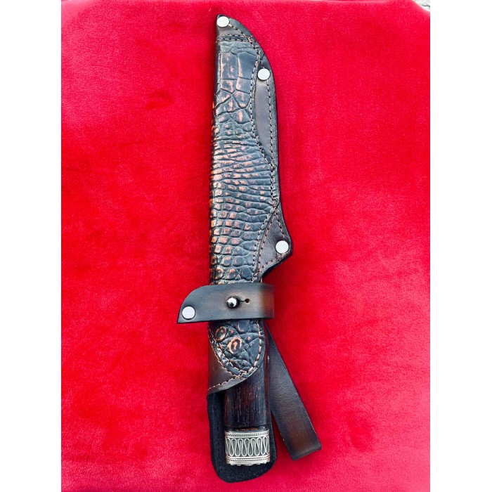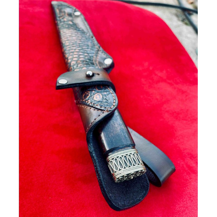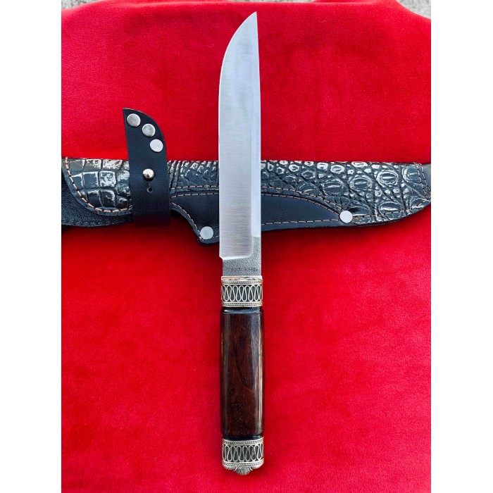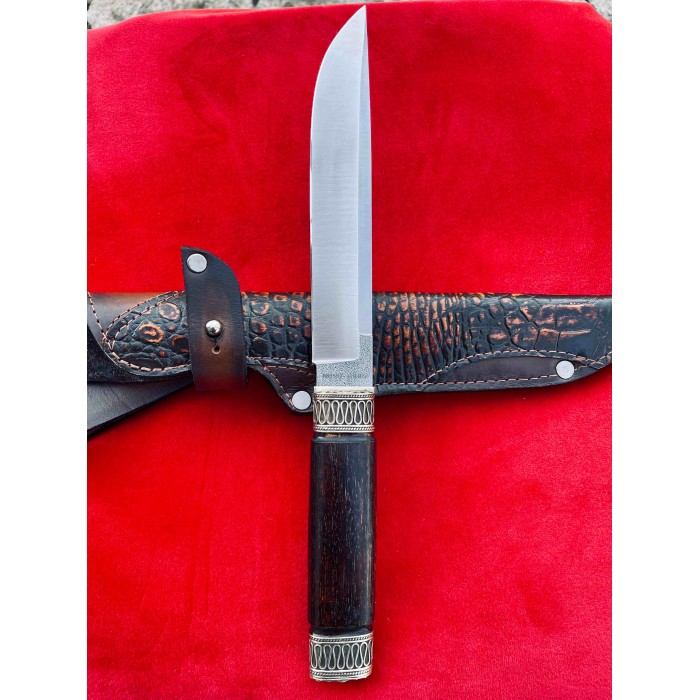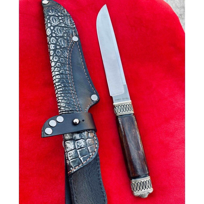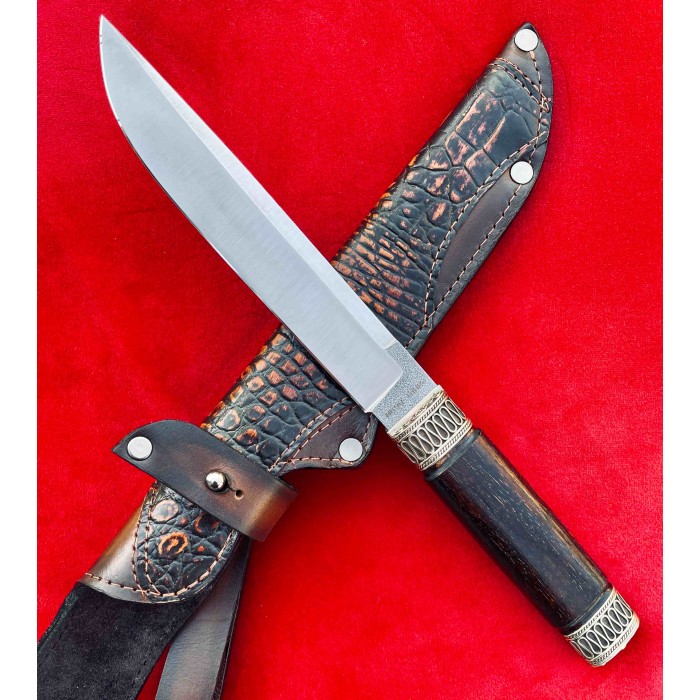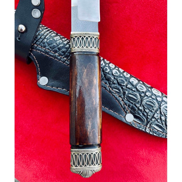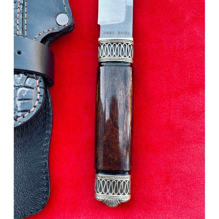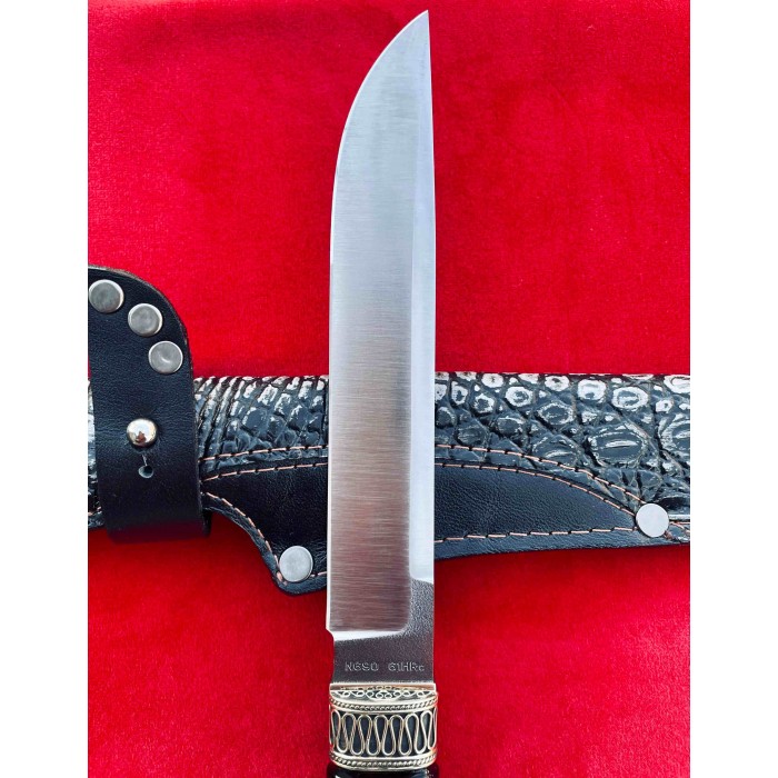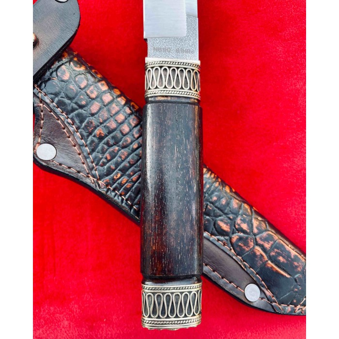 Рукоять ножа изготовлена из ореха отполированного до зеркального блеска, Гарда и тыльник изготовлены из бронзы с резными узорами. Благодаря такому исполнению нож очень удобно лежит в руке, имеет приятную текстуру и неимоверно выглядят, таким ножом Вы всегда сможете удивить своих друзей и близких. Клинок выполнен из высокопрочной нержавеющей австрийской стали N690,её твердость по Роквеллу составляет 61 единицу и имеет хвостовик который, проходит через всю рукоять. Таким образом Вы получаете бритвенно заточенное лезвие с невероятной прочностью которое при правильном уходе будет очень долго держать свою заточку. Так же у нас в магазине можно докупить ножны из качественной натуральной кожи. Нож изготавливается вручную мастером из Украины и имеет идеальное качество каждой детали.