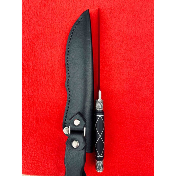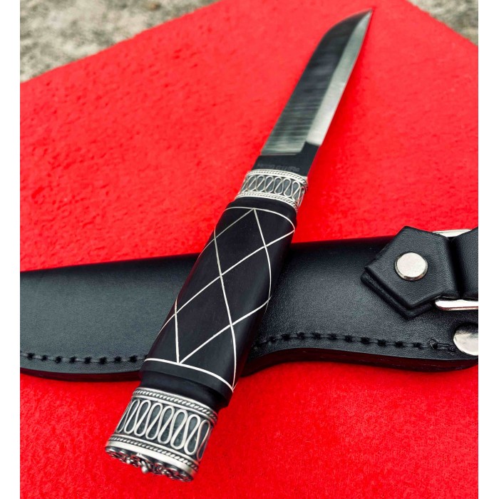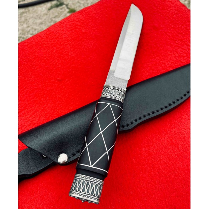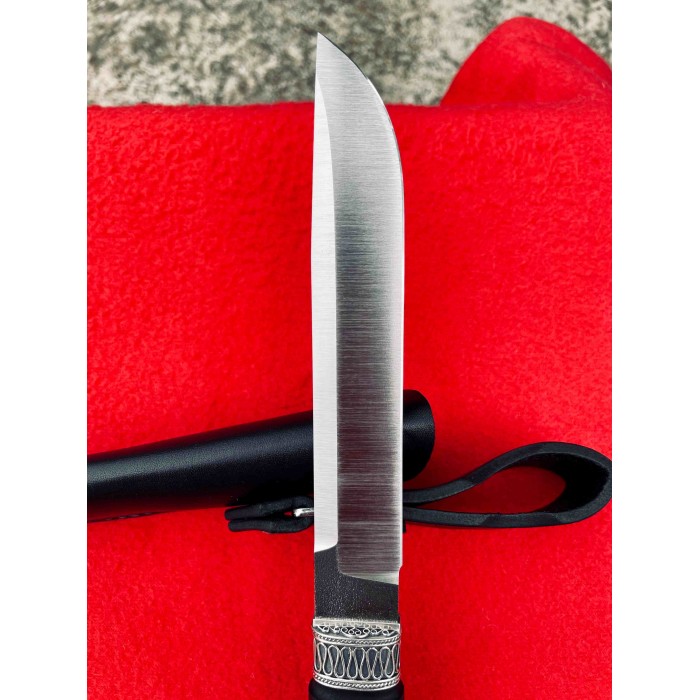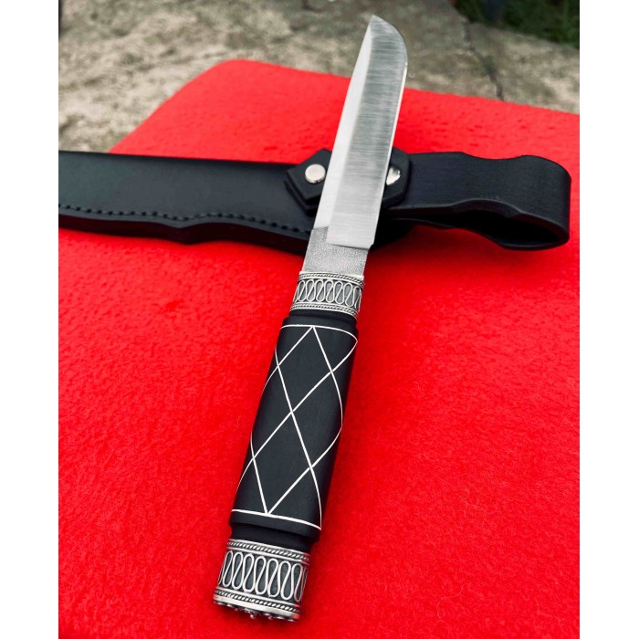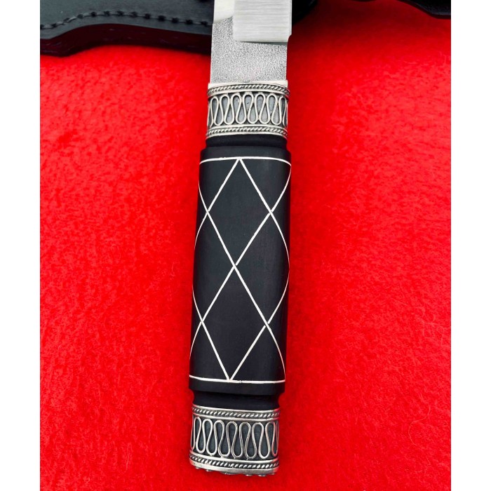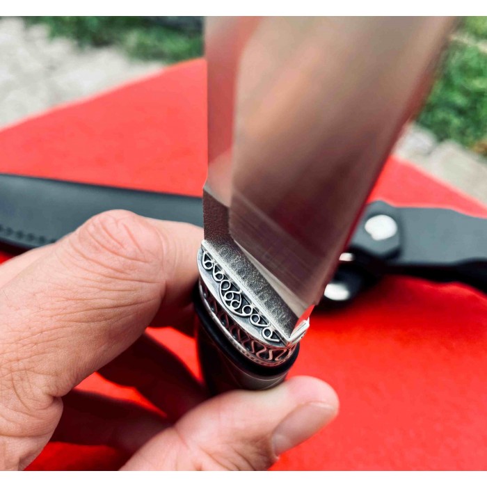 Рукоять ножа изготовлена из черного дерева отполированного до зеркального блеска и имеет декоративные вставки из серебра, Гарда и тыльник изготовлены из серебра с резными узорами. Благодаря такому исполнению нож очень удобно лежит в руке, имеет приятную текстуру и неимоверно выглядят, таким ножом Вы всегда сможете удивить своих друзей и близких. Клинок выполнен из высокопрочной нержавеющей австрийской стали N690,её твердость по Роквеллу составляет 61 единицу и имеет хвостовик который, проходит через всю рукоять. Таким образом Вы получаете бритвенно заточенное лезвие с невероятной прочностью которое при правильном уходе будет очень долго держать свою заточку. Так же у нас в магазине можно докупить ножны из качественной натуральной кожи. Нож изготавливается вручную мастером из Украины и имеет идеальное качество каждой детали.