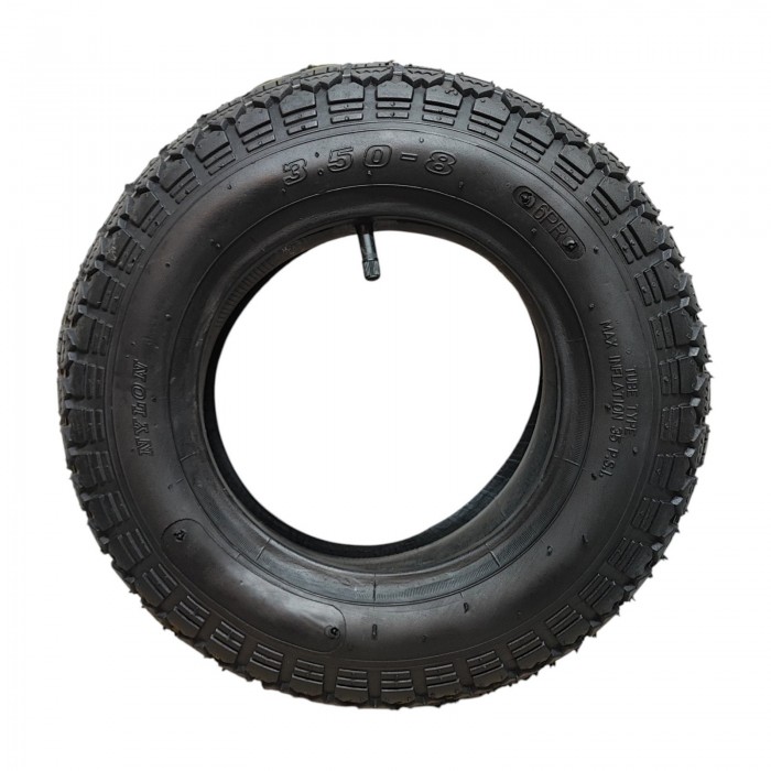 Покрышка 3.50-8 с камерой Good Tire, усиленная. Обладает повышенными характеристиками в отличии от бюджетных моделей, а именно норма слойности 6 PR и более высокое содержание резины в составе шины. Предназначенная для тачек или тележек с посадкой на обод в 8 дюймов, а ширина покрышки в надутом состоянии составляет 3.5 дюйма. Повышенное содержание и резины позволяет сделать покрышку более эластичной и в то же время более прочной. Данная покрышка прослужит вам намного дольше чем стандартная. Также благодаря повышенной прочности она менее подвержена проколам чем стандартные покрышки. По размерам покрышка полностью идентична любым другим. Также в комплекте с данной покрышкой идет камера, то-есть Вы получаете полный комплект для замены старой покрышки на новую.