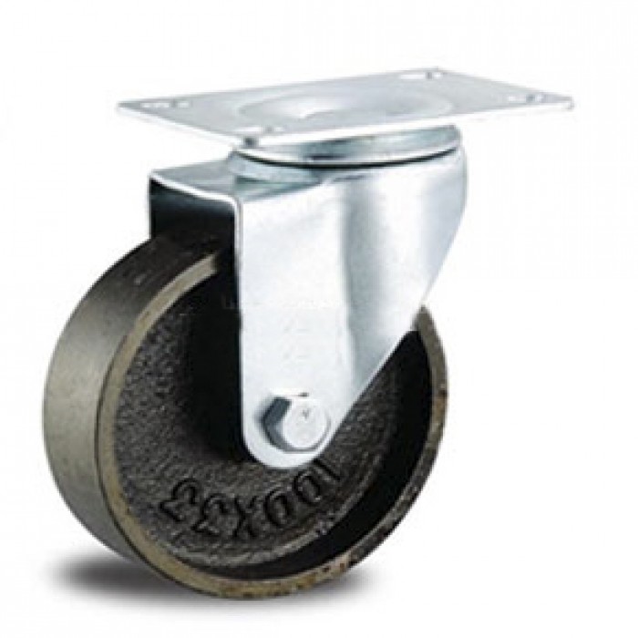 Чугунное колесо с поворотным механизмом отлито из чугуна и дополнительно обработана на токарном станке рабочая часть. Внутри установлен подшипник скольжения, он обеспечивает более равномерное распределение нагрузки. Чугунные колеса отличаются своей стойкостью к любым температурам, они способны работать от минус 40 до плюс 280 градусов, что позволяет использовать их в любых морозильных камерах или печах. Поворотный кронштейн изготовлен из двух частей самого крепежа колеса и поворотной площадки которые соединены и имеют шариковый подшипник в месте соединения, для обеспечения легкого поворота.