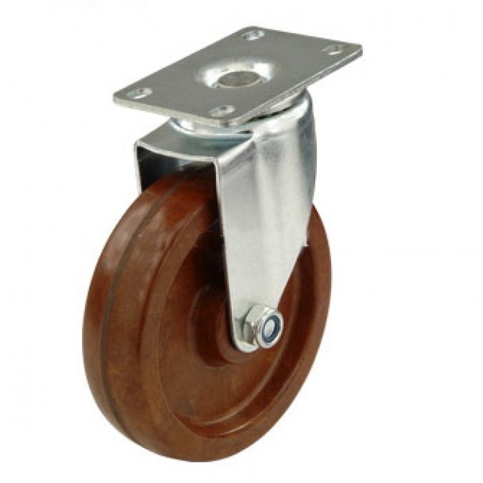 Колесо полностью изготовлено из фенольной смолы которая модифицирована фурфуриловым спиртом и имеет янтарный цвет. Такой состав отличается большой стойкостью к температуре и высокой прочностью, оно выдерживает нагрузку в 200 килограмм при размере в 12,5 сантиметров. Такое колесо обычно выбирают для стеллажей и тележек которые работают при высоких или низких температурах, оно выдерживает температуры от -50 до +250 градусов Цельсия. Внутри установлен подшипник скольжения. Сам кронштейн выполнен из оцинкованного металла и имеет кронштейн и площадку между которыми установлен двойной шариковый подшипник, он обеспечивает плавность поворотов.