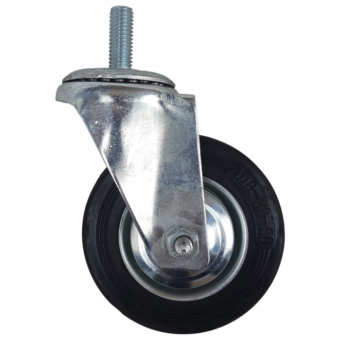 Поворотное колесо имеет кронштейн из оцинкованного металла, но вместо обычной площадки для крепления с 4 болтами установлен другой кронштейн с болтом который легко можно закрепить обычной гайкой. В месте соединения площадки с кронштейном установлен шариковый подшипник для более легкого поворота колеса, а что бы избежать попадания загрязнений в поворотный узел имеется специальный пыльник. Само колесо имеет штампованный диск из оцинкованного металла и игольчатый подшипник, который выдерживает большие нагрузки чем обычный. Для обеспечения плавного хода установлена шина из литой резины.