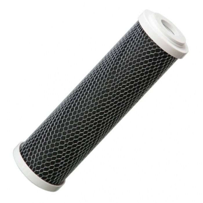 Данный фильтр наполнен активированным углем и применяется для очистки в основном как второй этап фильтрации, Он забирает из воды и хлорорганические соединения и позволяют удалить до 98% свободного хлора. Так же этот фильтр способен остановить некоторые металлы и нефтепродукты содержащиеся в водопроводной воде. Активированный уголь обладает высокой пористой структурой и большой внутренней поверхностью, благодаря этому обеспечивается необычайное высокая степень абсорбции. Данный фильтр может применяться как единственное стадий очистки, но при этом ресурс будет значительно меньше.