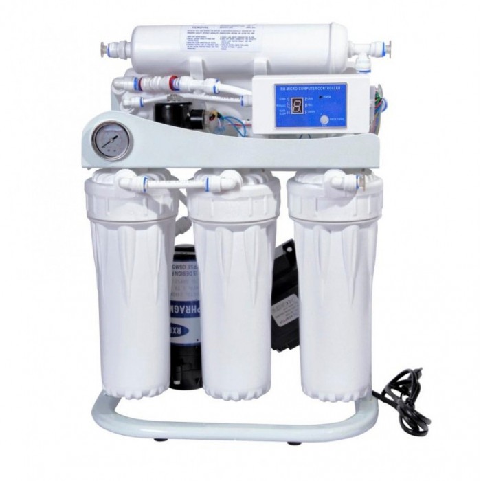 Обратный осмос предназначен для использования водопроводной воды в качестве питьевой и технической воды для приготовления пищи. Данная установка имеет электронный контроллер, он позволяет в автоматическом режиме контролировать загрязнения картриджей, также в автоматическом режиме сделать промывку мембраны что значительно увеличивает срок его службы, еще он Вам показывает назначение TDS метра. Для бесперебойной подачи воды осмос имеет помпу, которая подкачивает давление в системе если это необходимо. Также в комплекте идёт расширительный бачок на 45 литров. Эта система использует в шесть ступеней фильтрации. Первая ступень это фильтр из вспененного полипропилена для очистки от пыли, грязи, песка и других механических загрязнений. Вторая стадия это фильтр с гранулами из активированного угля, для очистки воды от хлора, органических соединений и удаления из воды неприятного запаха. Третья стадия это прессованный уголь, для очистки воды от хлора, органических соединений и загрязнений более 5 микрон. Четвертая стадия обратно осмотическая мембрана, она удаляет бактерии, тяжелые металлы, соли, вредные минеральные вещества и другие химические элементы растворенные в проточной воде. Пятая стадия угольный пост фильтр позволяющий удалить запах, привкус и органические субстанции прошедшие сквозь мембрану. Также в данную систему можно добавить и последующие элементы фильтрации по вашему желанию. В комплекте системы идёт полный набор для самостоятельной установки его под мойку.